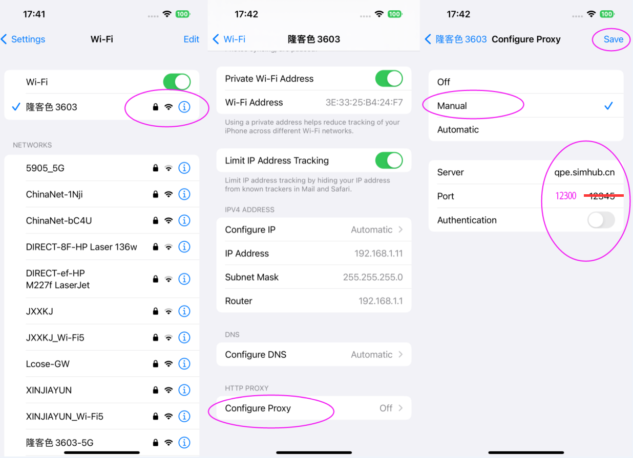 Turn off the WiFi proxy: Settings > Wi-Fi >